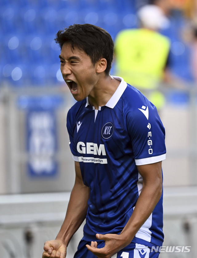 [카를스루에=AP/뉴시스] 카를스루에 SC의 최경록이 30일(현지시간) 독일 카를스루에의 빌트파크 경기장에서 열린 독일 2부 분데스리가 2라운드 SV 다름슈타트 98과의 경기 후반 31분경 팀의 두 번째 골을 넣고 기뻐하고 있다. 카를스루에는 필립 호프만의 멀티 골과 최경록의 골을 묶어 3-0으로 승리했다. 21.07.31.