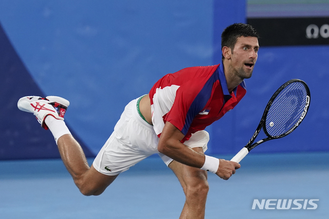 [도쿄=AP/뉴시스] 노바크 조코비치(1위·세르비아)가 30일 일본 도쿄의 아리아케 테니스파크에서 열린 도쿄올림픽 테니스 남자 단식 4강전에서 알렉산더 츠베레프(5위·독일)와 경기하고 있다. 조코비치는 츠베레프에게 세트 스코어 1-2(6-1 3-6 1-6)로 지면서 '골든 슬램' 도전이 무산됐다. 2021.07.31.