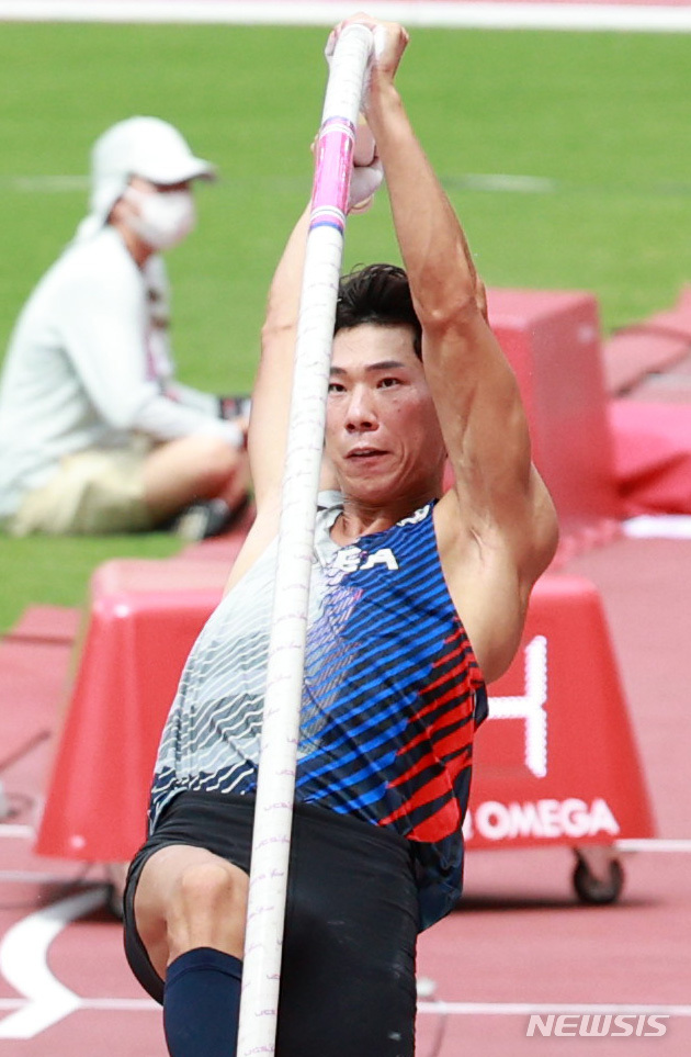 [도쿄(일본)=뉴시스] 이영환 기자 = 진민섭이 31일 오전 일본 도쿄 올림픽 스타디움에서 열린 도쿄올림픽 남자 장대높이뛰기 A조 예선에 참가하고 있다.  2021.07.31. [email protected]