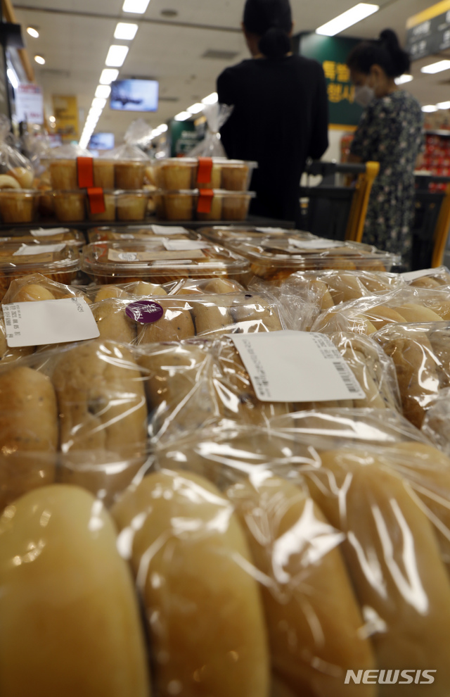 [서울=뉴시스] 고승민 기자 = 낙농진흥회에 따르면 우유의 원재료인 원유 가격이 21원 인상된다. 이에 따라 우유, 빵과 커피, 치즈 등 우유를 원료로 하는 식품 가격 역시 오를 것으로 예상되는 2일 서울의 한 대형마트에서 시민이 빵을 구입하고 있다. 2021.08.02. [email protected]