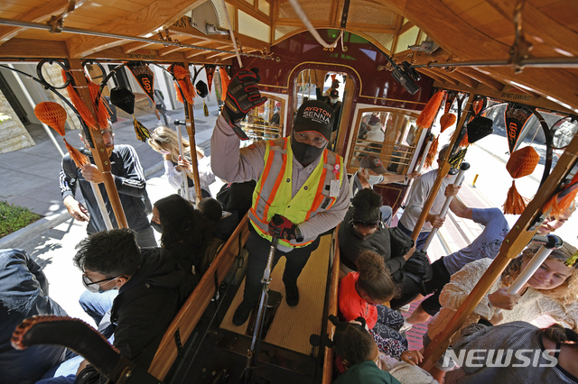 [샌프란시스코=AP/뉴시스] 2일(현지시간) 미 캘리포니아주 샌프란시스코의 파월-하이드 라인을 운행하는 케이블카에서 케이블카 운전사가 벨을 누르고 있다. 샌프란시스코 명물인 케이블카가 코로나19로 지난 16개월간 운행이 중단된 이후 경쾌한 종소리와 함께 시내 운행을 재개했다. 2021.08.03.