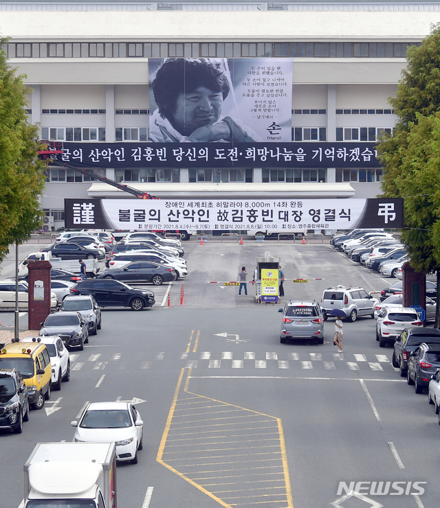[광주=뉴시스] 류형근 기자 = 8000m급 14좌 마지막 봉우리 브로드피크(8047m급) 등정에 성공한 뒤 하산하던 중 실종된 장애 산악인 김홍빈 대장의 장례절차가 4일부터 8일까지 산악인장으로 치러진다. 3일 오후 분향소가 설치되는 광주 서구 염주종합체육관에 김 대장을 기리는 대형 현수막이 설치되고 있다. 2021.08.03. [email protected]