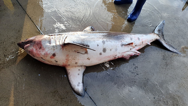 [강릉=뉴시스] 김경목 기자 = 4일 오전 강원 강릉시 주문진읍 어판장에서 악상어(salmon shark) 포획 여부 조사가 진행되고 있다. 몸길이 2.5m 둘레 90㎝로 조사됐다. (사진=속초해양경찰서 제공) 2021.08.04. [email protected]