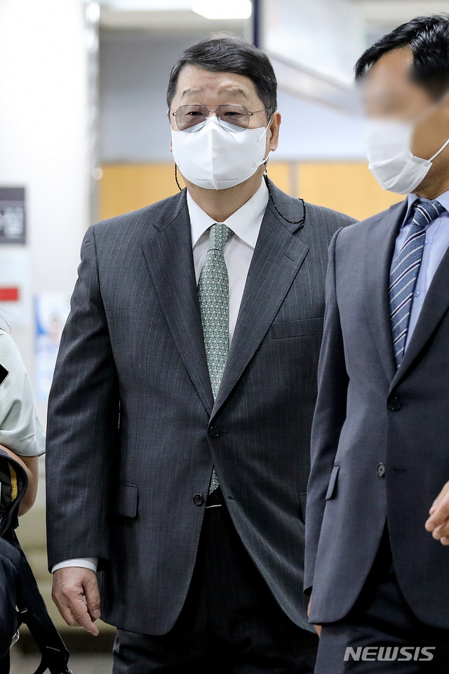 [서울=뉴시스] 김병문 기자 = 일감 몰아주기 혐의를 받는 구자엽 LS전선 회장이 10일 오후 서울 서초구 서울중앙지방법원에서 열린 첫 공판에 출석하고 있다. 2021.08.10. [email protected]