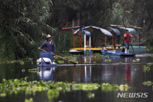 [멕시코시티=AP/뉴시스] 아스테카 왕국의 수도 테노치티틀란(지금의 멕시코시티) 함락 500주년을 하루 앞둔 12일(현지시간) 멕시코 수도 멕시코시티 소치밀코에서 한 농민이 '치남파'로 알려진 '수상 채소밭'을 지나고 있다. 아스테카 왕국은 1521년 8월 13일 스페인에 함락돼 300년간 점령당했다. 소치밀코의 운하와 떠다니는 정원은 아스텍인들이 테노치티틀란을 위해 건설한 광대한 수상 교통 시스템의 마지막 잔해로 알려져 있다. 2021.08.13.