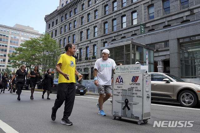 [보스턴=AP/뉴시스] 폴 베네토(오른쪽) 전 UA 항공 승무원이 지난 21일(현지시간) 미 매사추세츠주 보스턴 거리에서 항공기 기내 음료 카트를 밀면서 보스턴 마라톤 관계자와 얘기하고 있다. 베네토는 2001년 9월11일 UA175편이 세계무역센터 건물과 충돌하면서 동료들을 잃었으며 911테러 20주기를 앞두고 보스턴에서 뉴욕의 '그라운드 제로'까지 음료 카트를 밀면서 당시 희생된 친구들을 기리고 있다. 2021.08.24.