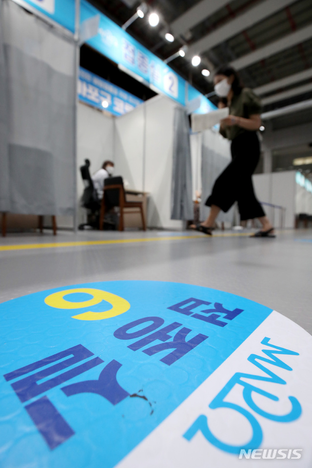 [서울=뉴시스] 김병문 기자 = 18~49세 대상 예방접종 시작을 하루 앞둔 25일 오전 서울 마포구민체육센터에 마련된 코로나19 예방접종센터에서 시민이 주사를 맞기 위해 접종실로 들어서고 있다. 정부는 40대 이하 예방접종 시기를 보름여 앞당겨 추석연휴 전까지 전 국민 70%가 백신을 맞도록 할 계획이다. 2021.08.25. [email protected]