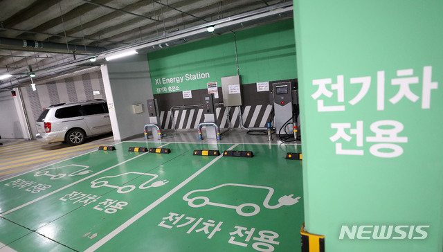 [서울=뉴시스] 백동현 기자 = 27일 오후 서울시내 한 아파트 단지 주차장에 전기차 전용 충전소가 설치되어 있다. 이날 산업통상자원부는 내년부터 신축 아파트는 총 주차면수의 5%, 구축 아파트는 2% 이상 규모로 전기차 충전기를 의무 설치해야 한다는 내용을 담은 시행령 일부개정령안을 입법예고한다고 밝혔다. 2021.08.27. [email protected]