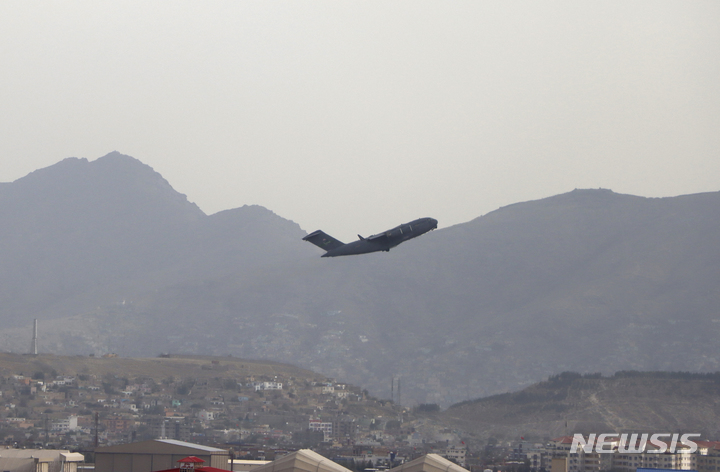 [카불(아프가니스탄)=AP/뉴시스] 미군 항공기가 30일(현지시간) 아프가니스탄 카불 하미드 카르자이 국제공항에서 이륙하고 있다. 이날 케네스 매켄지 미국 중부사령관은 워싱턴 국방부에서 열린 기자회견을 통해 "아프간 철수와 미국인, 제3국 국적자, 아프간 취약층 대피 임무가 완료됐다"고 밝혔다. 2021.08.31.