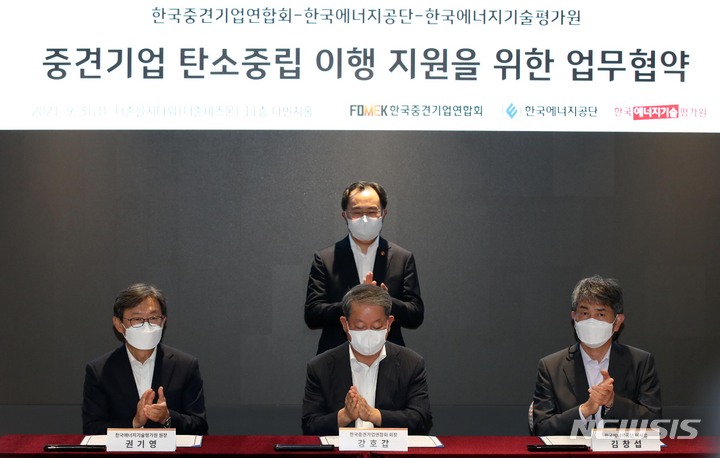 [서울=뉴시스] 고범준 기자 = 강호갑 한국중견기업연합회 회장이 3일 오후 서울 중구 더존을지타워 다빈치홀에서 열린 중견기업 탄소중립 이행 지원을 위한 업무협약식에서 참석자들과 협약서에 사인을 마치고 박수치고 있다. 왼쪽부터 권기영 한국에너지기술평가원 원장, 강호갑 한국중견기업연합회 회장, 김창섭 한국에너지공단 이사장. 2021.09.03. [email protected]