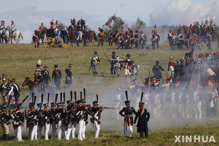 [보로디노=신화/뉴시스] 5일(현지시간) 러시아 모스크바 외곽의 보로디노 마을 인근에서 참가자들이 1812년 러시아를 침략한 프랑스군과의 보로디노 전투를 재현하고 있다. 당시 나폴레옹은 이 전투에서 큰 타격을 입은 것으로 알려졌다. 2021.09.06.