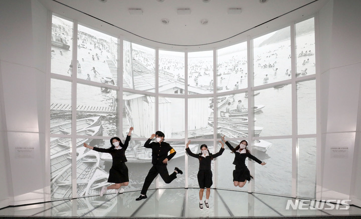 [서울=뉴시스] 김선웅 기자 = 7일 서울 송파구 롯데월드타워 전망대 서울스카이에서 관람객들이 미디어 체험전 '시간, 하늘에 그리다'를 즐기고 있다. 서울스카이는 지난 1일 부터 한국 광고 및 패션 사진의 선구자 ‘한영수’ 작가가 함께한 미디어 체험전을 오픈했다. MZ세대를 타겟으로 1960년대 활기 있고 생동감 넘치는 서울의 모습을 미디어 아트와 체험존, 갤러리 형식을 통해 현대적으로 재해석해 선보인다. 일반적인 사진 전시회에서 벗어나 마치 사진 속 주인공이 관람객과 함께 걷고 교감하는 듯한 느낌을 주는 체험형 전시다. 2021.09.07. [email protected]