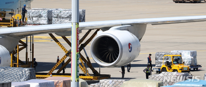 [인천공항=뉴시스] 이영환 기자 = 화이자사와 개별 계약한 코로나19 화이자 백신 342만8000회분이 8일 오후 인천국제공항 화물터미널에 도착해 백신 수송 관계자들이 백신을 수송하고 있다. 2021.09.08. [email protected]
