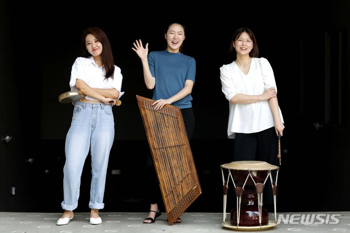 [서울=뉴시스] 박진희 기자 = 여성 타악 앙상블 ‘groove&'(그루브앤드) 김하경(왼쪽부터), 이상경, 손민주가 지난 9일 서울 서초구 국립국악원에서 뉴시스 인터뷰를 마치고 사진촬영을 하고 있다. 2021.09.11. [email protected]