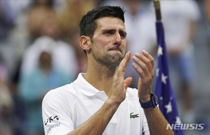 [뉴욕=AP/뉴시스] 노바크 조코비치(1위·세르비아)가 12일(현지시간) 미국 뉴욕 빌리진 킹 내셔널 테니스센터의 아서애시스타다움에서 열린 US오픈 테니스 선수권 남자 단식 결승전에서 다닐 메드베데프(2위·러시아)에 패한 후 팬들에 인사하며 눈물을 글썽이고 있다. 조코비치는 메드베데프에 세트 스코어 0-3(4-6 4-6 4-6)으로 완패하며 캘린더 그랜드슬램 도전에 실패했다. 2021.09.13.