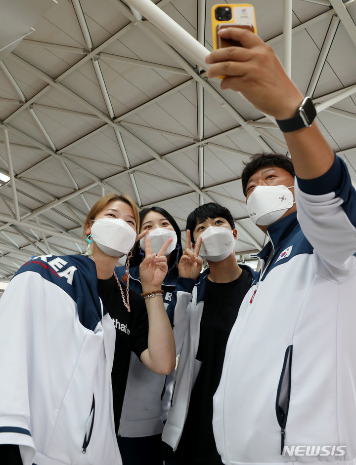 [인천공항=뉴시스] 추상철 기자 = 여자 양궁 대표팀 강채영(왼쪽부터), 장민희, 안산이 15일 오후 인천국제공항에서 2021 세계양궁선수권대회 참가를 위해 출국하기 전 휴대폰 카메라로 기념촬영을 하고 있다. 이번 대회는 오는 19일부터 26일까지 미국 양크턴에서 8일간 치러진다.2021.09.15. [email protected]