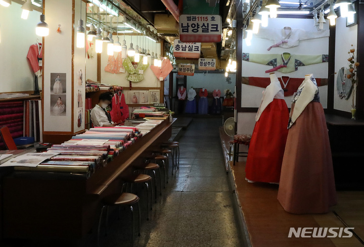[서울=뉴시스] 백동현 기자 = 추석을 닷새 앞둔 16일 오후 서울 종로구 광장시장 한복상가에서 가게 주인이 손님을 기다리고 있다. 2021.09.16. [email protected]