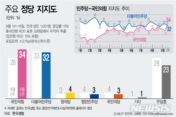 [서울=뉴시스] 17일 한국갤럽이 발표한 9월 3주차 정당 지지도 결과에 따르면 국민의힘은 34%, 더불어민주당 지지도는 32%로 집계됐다. (그래픽=전진우 기자)