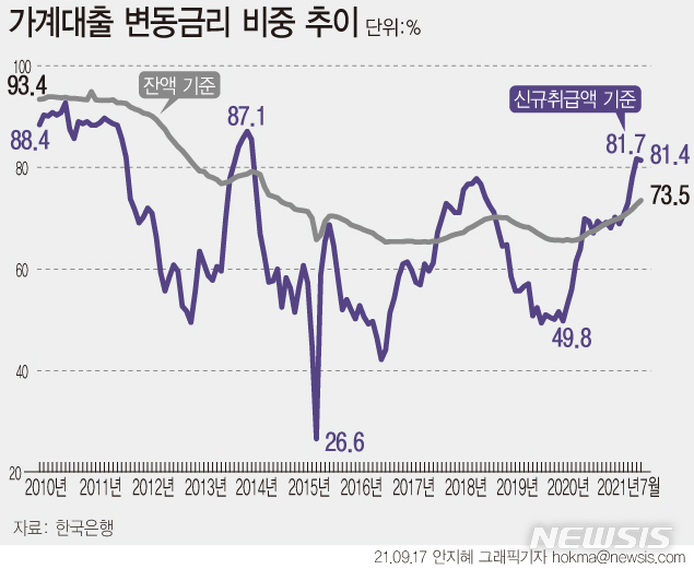 [서울=뉴시스] 한국은행의 추가 금리 인상 예고에도 불구하고 7월 신규 가계대출 중 변동금리 대출 비중이 80%를 넘어섰다. 잔액기준으로는 7년만에 최고치를 기록했다. (그래픽=안지혜 기자)