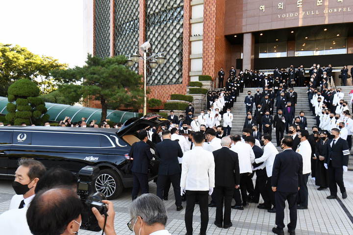 [서울=뉴시스] 18일 오전 서울 영등포구 여의도순복음교회 대성전에서 고 조용기 원로목사의 천국환송예배를 마친 유가족들과 교회 관계자들이 차량으로 운구하고 있다. (사진=국민일보 제공) 2021.09.18. [email protected]