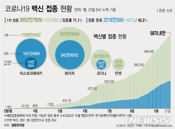 [서울=뉴시스] 21일 코로나19 예방접종대응추진단에 따르면 전날인 20일 1차 접종자는 2만1683명 늘어 누적 3652만7829명이다. 전체 국민의 71.1%가 1차 접종을 마쳤다. 접종 완료자는 전체 인구의 43.2%인 2218만500명이다. (그래픽=전진우 기자)