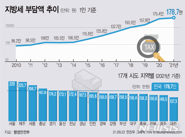 [서울=뉴시스] 22일 행정안전부 지방재정 통합공개시스템인 '지방재정365'에 따르면 올해 전국 국민 1인당 지방세 부담액(지방세액을 주민등록 인구 수로 나눈 금액)은 178만7000원이다.지난해의 175만4000원보다 3만3000원(1.9%) 늘었다. (그래픽=전진우 기자)