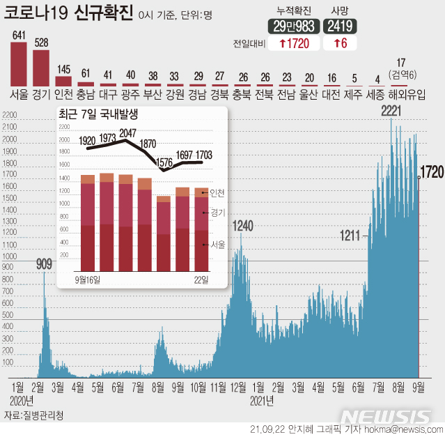 [서울=뉴시스] 22일 0시 기준 코로나19 누적 확진자는 전날보다 1720명 증가한 29만983명이다. 지역별로 서울 641명, 경기 528명, 인천 145명 등 수도권에서 1314명(77.2%)이 발생했다. (그래픽=안지혜 기자)