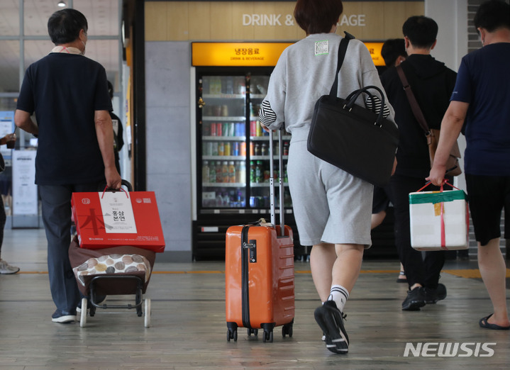 [서울=뉴시스] 권창회 기자 = 추석 연휴 마지막날인 22일 오전 서울 서초구 서울고속버스터미널에서 시민들이 짐꾸러미를 끌고 이동하고 있다. 2021.09.22. [email protected]