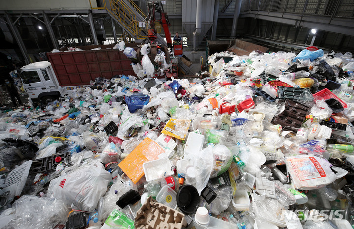 [대구=뉴시스] 이무열 기자 = 추석 연휴가 끝난 23일 오전 대구 수성구 생활자원회수센터에 한꺼번에 밀려든 선물 포장용 비닐과 스티로폼이 산더미처럼 쌓여있다. 센터관계자는 "코로나19 이전 추석보다 비닐과 플라스틱은 2배, 스티로폼은 5배가량 많이 수거되고 있다"고 밝혔다. 2021.09.23. [email protected]