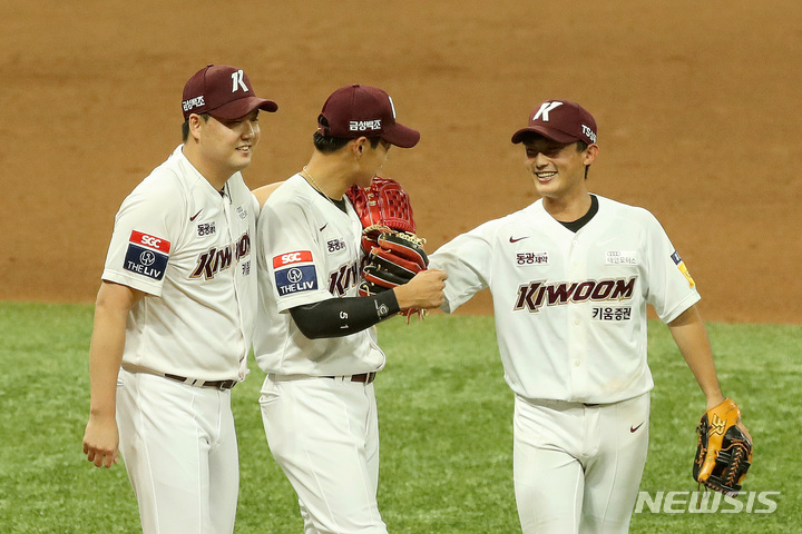 [서울=뉴시스] 김병문 기자 = 23일 오후 서울 구로구 고척스카이돔에서 열린 '2021 신한은행 SOL KBO 리그' 키움 히어로즈 대 NC 다이노스의 경기, NC를 4:1로 꺾은 키움 선수들이 기뻐하고 있다. 2021.09.23. [email protected]