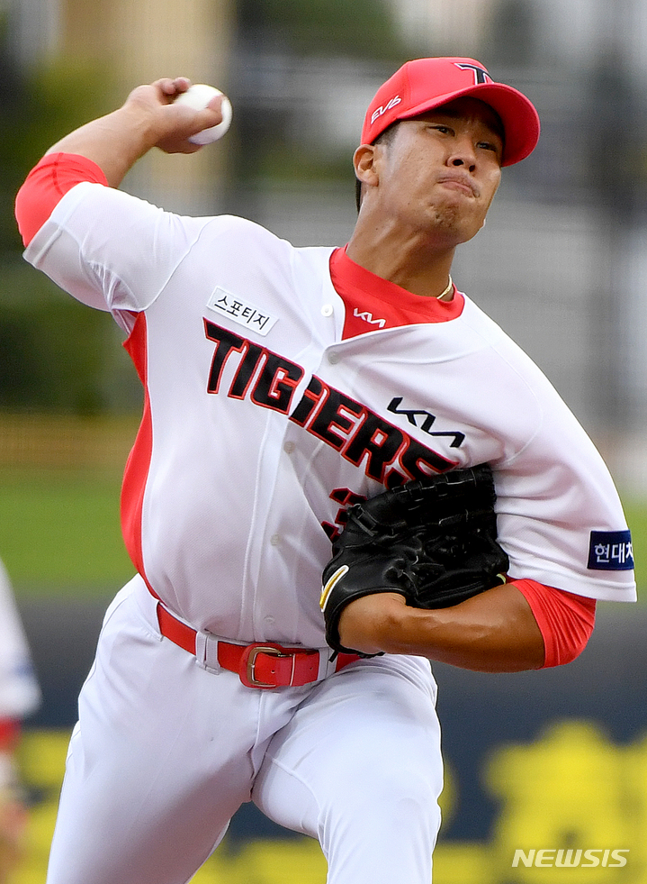 [광주=뉴시스] 신대희 기자 = 25일 오후 광주 북구 광주-기아챔피언스필드에서 열린 2021프로야구 KIA 타이거즈 대 SSG 랜더스의 경기, 1회초 무사에서 KIA 선발투수 보 다카하시가 역투하고 있다. KIA 타이거즈 새 외국인 투수 다카하시(일본계 3세 브라질 국적)는 이날 KBO리그 데뷔전을 치렀다. 2021.09.25. [email protected]