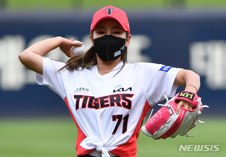 [광주=뉴시스] 신대희 기자 = 26일 오후 광주 북구 광주-기아챔피언스필드에서 열린 2021프로야구 KIA 타이거즈 대 SSG 랜더스의 경기, 가수 송가인이 시구를 하고 있다. 2021.09.26. [email protected]