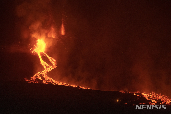 [라팔마=AP/뉴시스] 28일(현지시간) 스페인 카나리아 제도 라 팔마섬의 쿰브레 비에호 화산에서 용암이 흘러내리고 있다. 전문가들은 쿰브레 비에호 화산의 활동이 줄어들기는 했지만 폭발이 멈췄다고 선언하기엔 이르다고 조언했다. 당국은 바닷물과 용암이 만나면서 인체에 해로운 가스가 발생하므로 주민들에게 당분간 실내에 머물 것을 당부했다. 2021.09.28.
