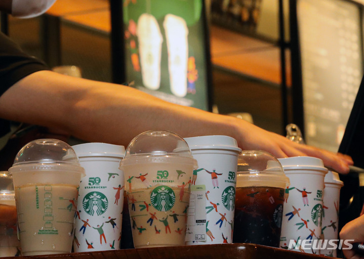 [서울=뉴시스] 권창회 기자 = 28일 오전 서울 중구 스타벅스 프레스센터점에 리유저블 컵에 담긴 커피가 놓여있다. ‘리유저블 컵 데이’는 스타벅스 50주년과 세계 커피의 날(10월 1일)을 기념해 진행되는 캠페인이다. 일회용 컵 사용 절감에 대한 친환경 메시지를 전달하기 위해 기획됐다. 2021.09.28. [email protected]