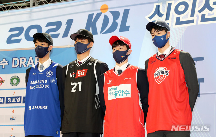 [서울=뉴시스] 고범준 기자 = 28일 오후 서울 송파구 잠실학생체육관에서 열린 '2021 KBL 신인선수 드래프트'에서 1라운드에 지명된 선수들이 포즈를 취하고 있다. 왼쪽부터 서울 삼성 썬더스 1순위 이원석, 수원 KT 소닉붐 2순위 하윤기, 고양 오리온 오리온스 3순위 이정현, 울산 현대모비스 피버스 4순위 신민석. 2021.09.28. [email protected]