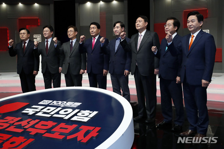 [서울=뉴시스] 최동준 기자 = 국민의힘 대선 경선 예비후보들이 28일 서울 상암동 MBC에서 열린 대선 경선 4차 방송토론회에서 기념촬영을 하고 있다. 왼쪽부터 황교안, 유승민, 최재형, 안상수, 하태경, 윤석열, 홍준표, 원희룡 후보. 2021.09.28. [email protected]