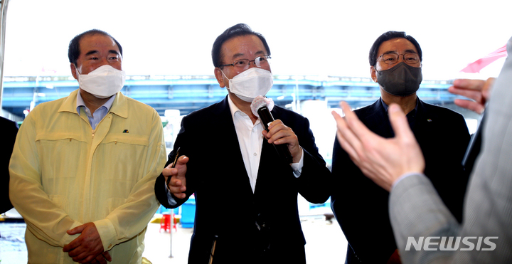 [속초=뉴시스] 김경목 기자 = 29일 오후 김부겸 총리가 사회적 거리두기 4단계 지역인 강원도 속초시 속초청년몰 갯배St를 찾아 박현수(34) 상인회장 등 청년 상인들과 간담회를 하고 있다. 2021.09.29. [email protected]