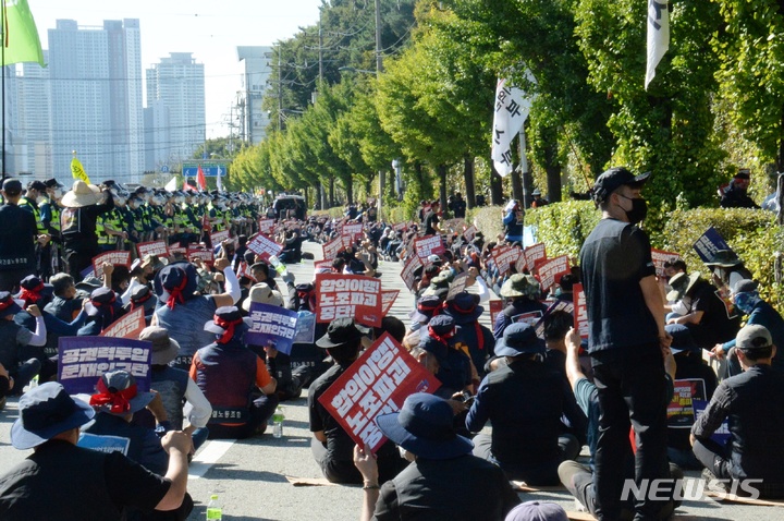 [청주=뉴시스] 조성현 기자 = 30일 오후 민주노총 공공운수노조 화물연대 회원들이 청주시 흥덕구 송정동 SPC삼립 청주공장 인근 도로를 점령하고 SPC자본과 경찰을 규탄하는 대규모 집회를 하고 있다. 8차선 도로 중 2개 차선을 점거한 이들은 ''SPC자본 계약 해지 철회"를 외치며 대규모 농성에 돌입했다. 2021.09.30. [email protected]
