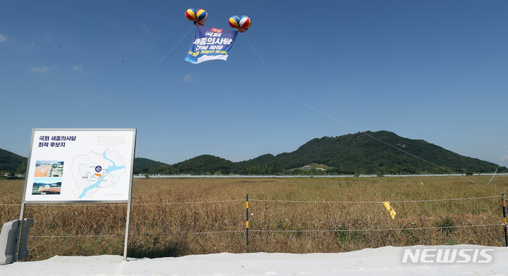 [세종=뉴시스] 강종민 기자 = 세종시에 국회의사당 분원을 설치하는 국회법 개정안이 국회 본회의를 통과한 가운데 29일 세종시 국회 세종의사당 후보지에 대형 현수막이 걸려 있다. 2021.09.30. [email protected]