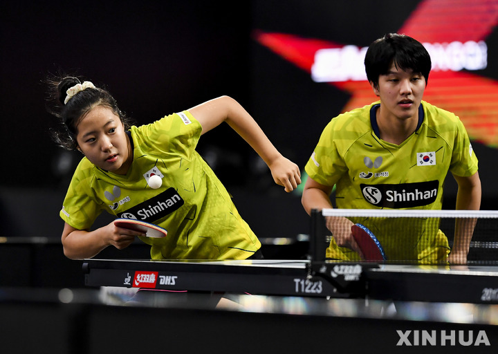 [도하=신화/뉴시스] 신유빈(왼쪽)과 안재현이 9월30일(현지시간) 카타르 도하에서 열린 2021 ITTF-ATU 아시아탁구 선수권대회 혼합복식 32강전 몽골과 경기하고 있다. 신유빈-안재현은 몽골을 3-0으로 완파하고 16강에 올랐다. 2021.10.01.