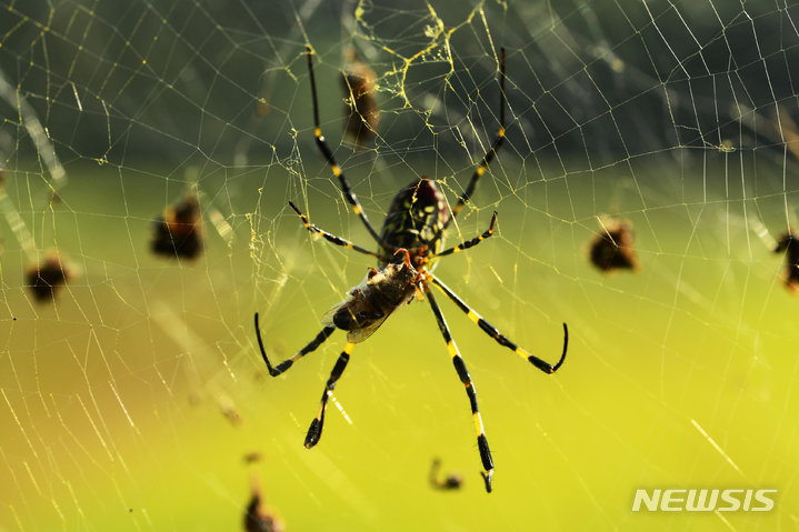 [남해=뉴시스] 차용현 기자 = 화창한 가을날씨를 보인 2일 오전 경남 남해군 서면 인근에서 무당거미 한 마리가 거미줄에 걸리 꿀벌을 사냥하고 있다. 2021.10.02. [email protected]