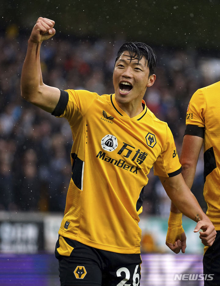 [울버햄프턴=AP/뉴시스] 울버햄프턴 원더러스의 황희찬이 2일(현지시간) 영국 울버햄프턴의 몰리뉴 경기장에서 열린 2021~22 잉글랜드 프리미어리그(EPL) 7라운드 뉴캐슬 유나이티드와의 경기 전반 20분 선제골을 넣고 환호하고 있다. 황희찬은 후반 13분에도 결승 골 등 멀티골을 기록하며 팀의 2-1 승리를 이끌었다. 2021.10.03.