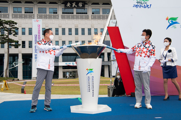 [안동=뉴시스] 박홍식 기자 = 장세용(왼쪽) 경북 구미시장과 이철우 경북도지사가 4일 경북도청 광장에서 열린 '제102회 전국체육대회·제41회 전국장애인체육대회' 성화 봉송 출발식에 앞서 강화도 마니산에서 채화된 불을 성화대에 점화하고 있다. (사진=구미시 제공) 2021.10.04 [email protected]