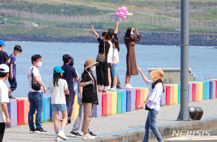 [제주=뉴시스] 우장호 기자 = 개천절 연휴 마지막 날인 4일 오후 제주시 도두동 무지개해안도로가 막바지 휴일을 즐기려는 가족과 친구, 연인들의 발걸음으로 혼잡한 모습을 보이고 있다. 2021.10.04. [email protected]