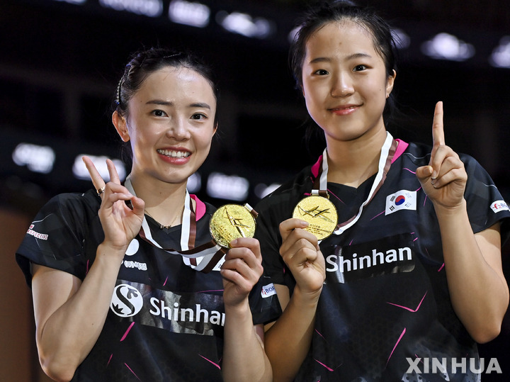 [도하=신화/뉴시스] 전지희(왼쪽)와 신유빈이 5일(현지시간) 카타르 도하의 루사일 스포츠아레나에서 열린 2021 ITTF-ATTU 아시아탁구 선수권 여자 복식 결승에서 홍콩의 리호칭-두호이켐을 물리치고 우승, 시상대에 올라 금메달을 목에 걸고 포즈를 취하고 있다. 전지희-신유빈은 결승전에서 홍콩을 세트스코어 3-1(11-5 7-11 11-3 11-4)로 꺾고 메이저대회 여자 복식 첫 우승을 일궈냈다. 2021.10.06.