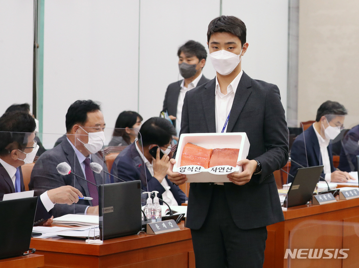 [서울=뉴시스] 최진석 기자 = 더불어민주당 윤재갑 의원이 7일 국회 농림축산식품해양수산위원회 해양수산부 국정감사에서 문성혁 해수부 장관에게 보좌관이 든 양식과 자연산 연어의 차이에 대해 질의하고 있다. 2021.10.7 (공동취재사진) 2021.10.07. [email protected]