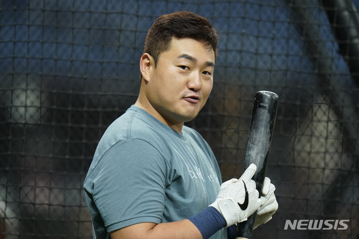 [세인트피터즈버그=AP/뉴시스] 탬파베이 레이스 최지만이 7일(현지시간) 미 플로리다주 세인트피터즈버그의 트로피카나 필드에서 열리는 2021 아메리칸리그 디비전 시리즈(ALDS) 보스턴 레드삭스와의 1차전을 앞두고 타격 연습을 하고 있다. 2021.10.08.