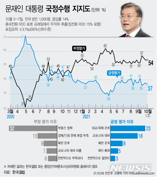 [서울=뉴시스] 한국갤럽은 10월 1주차 문재인 대통령의 직무수행 평가를 조사한 결과 37%가 긍정 평가를 기록했다고 1일 밝혔다. 부정 평가는 54%이다. (그래픽=전진우 기자)