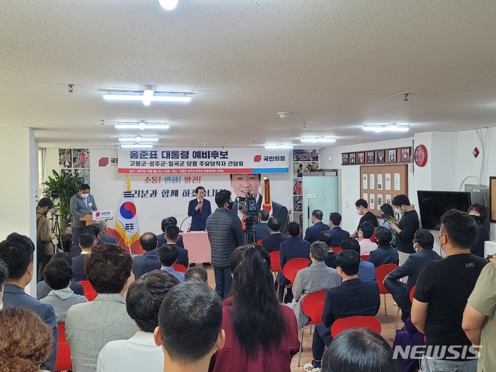 [칠곡=뉴시스] 박홍식 기자 = 홍준표 국민의힘 대선 경선 후보가 8일 오전 경북 고령·성주·칠곡 당협협의회 사무실에서 주요 당직자와 간담회를 하고 있다. 2021.10.08 [email protected]
