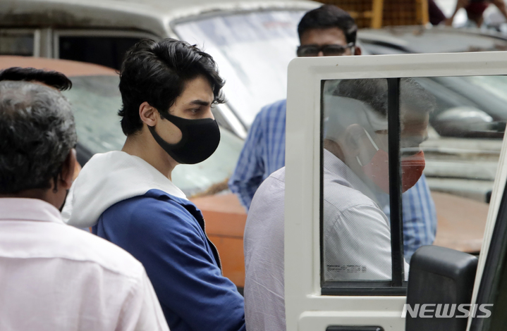 [뭄바이=AP/뉴시스] 마약 혐의로 지난 2일(현지시간) 체포된 발리우드 인기 배우 샤룩 칸의 아들 아리안 칸(23·가운데)이 8일(현지시간) 인도 뭄바이에서 검사를 받기 위해 마약 단속국(NCB) 차량에 탑승하고 있다. 2021.10.08.